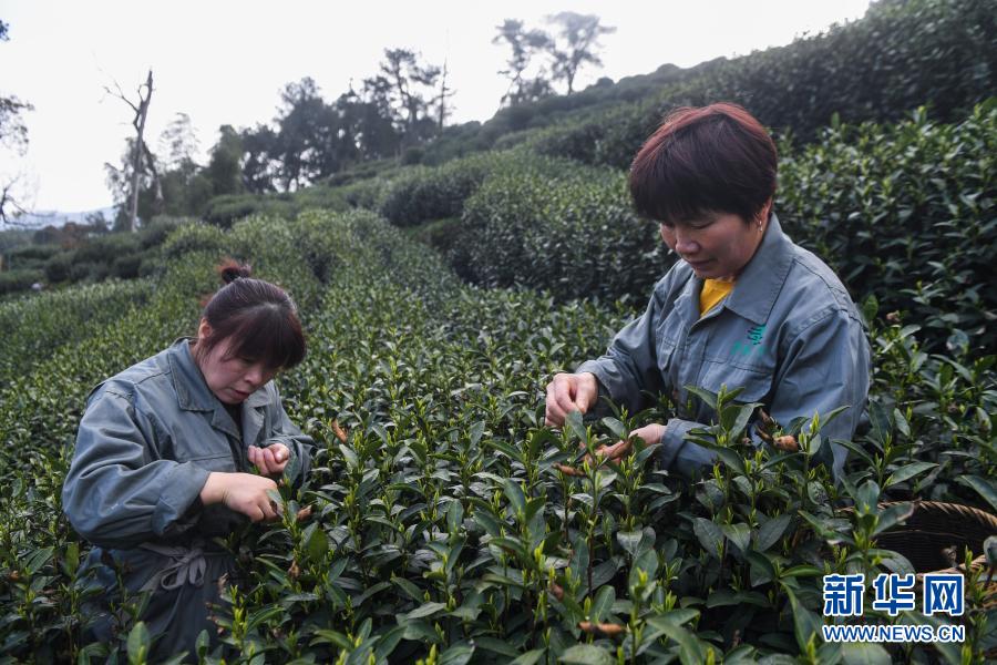 3月12日,在位于杭州市西湖風(fēng)景名勝區(qū)滿覺隴村白鶴峰的西湖龍井茶葉基地,茶農(nóng)在采摘西湖龍井頭茶,這里是西湖龍井茶核心產(chǎn)區(qū)之一。