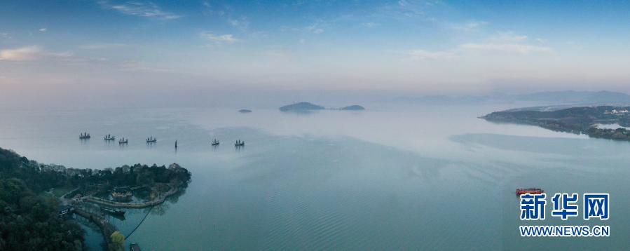 3月13日拍攝的江蘇省無錫市太湖黿頭渚景區(qū)晨景(無人機全景照片)。