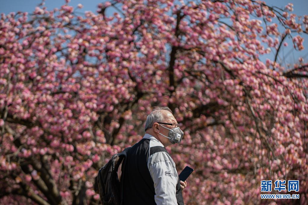 4月20日,一名男子在法國巴黎近郊的國璽公園欣賞櫻花。
