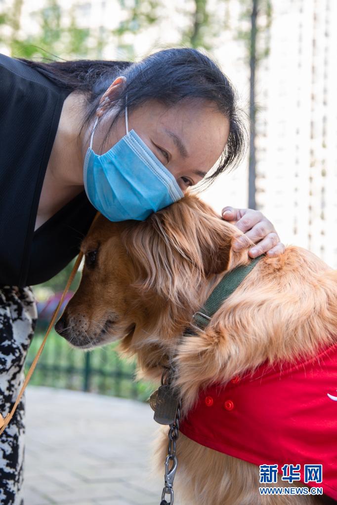生活在南京市建鄴區(qū)的陳冬梅與導盲犬“果凍”在一起(4月4日攝)?! ⌒氯A社發(fā) (張夢 攝)