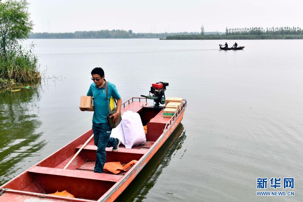 6月20日,在微山縣南陽鎮(zhèn)丁樓村,郵遞員王少朋將郵船停穩(wěn)后,帶上郵件為村民投遞。