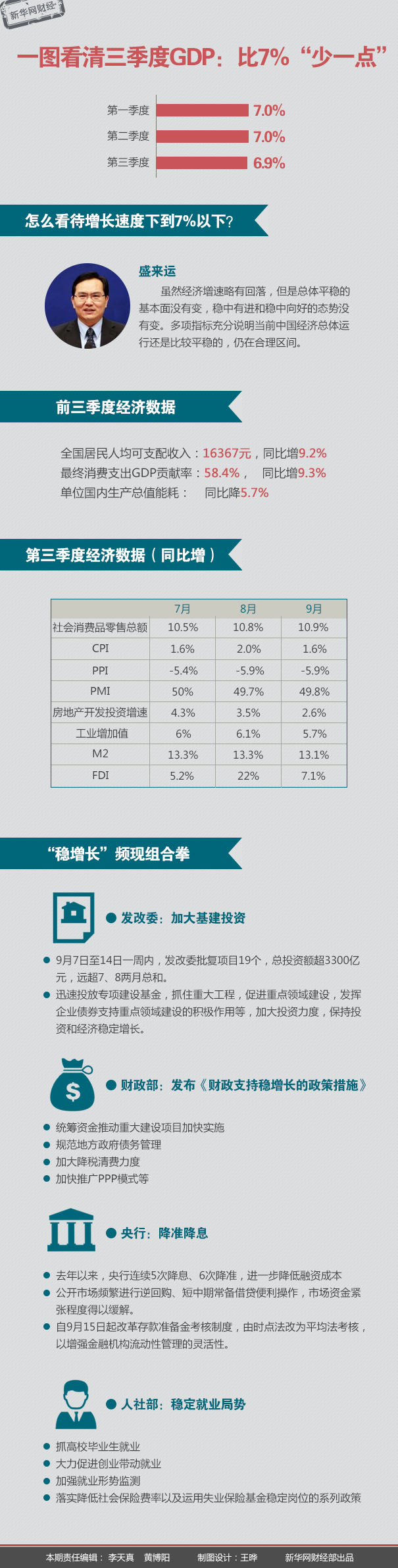 ????新華網(wǎng)北京10月19日電(記者 徐曼曼)備受關注的中國經(jīng)濟“三季報”今日揭開面紗。國家統(tǒng)計局數(shù)據(jù)顯示,三季度GDP同比增幅為6.9%,創(chuàng)下自2009年以來的最低增速,系官方首次以分季方式核算的GDP數(shù)據(jù)。初步核算,前三季度國內(nèi)生產(chǎn)總值487774億元,按可比價格計算,同比增長6.9%。