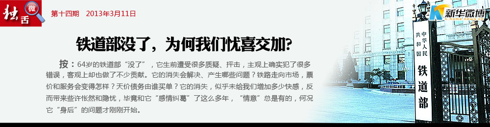 @秋水伊人:之前累積的債務問題如何解決?誰是還債主體?明年春運被“吐槽”的是誰?撤銷鐵道部體現(xiàn)了改革的決心,希望能有好的轉(zhuǎn)變。