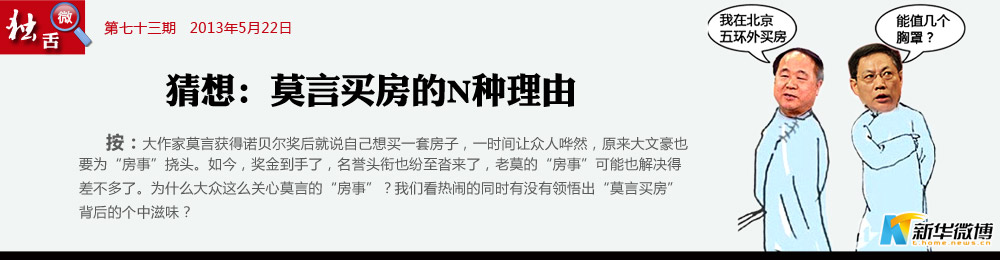 猜想二:安得廣廈五環(huán)外 安居才能樂業(yè),即便莫言用諾貝爾獎金買房,也是可以理解的。一直以來,文人的命運(yùn),往往與時(shí)代命運(yùn)息息相關(guān)。居高不下的房價(jià),卻是百姓之痛。