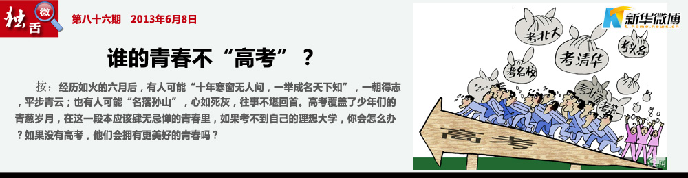 【為經(jīng)濟(jì)做貢獻(xiàn)】 算算高考,用了12年青春,至少四五十萬的學(xué)費(fèi),我們養(yǎng)活了晨光廠、真彩廠、機(jī)讀卡廠、無數(shù)造紙廠、無數(shù)印刷場,翰林書店、新華書店,城市的交通行業(yè),學(xué)校周邊的飯館,以及所有老師的工資獎(jiǎng)金、校長的車、油錢……高考是國家支柱型民營企業(yè)!這就是我們的功勞!