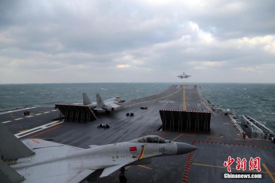 資料圖:2016年12月23日,在黃海某??沼?,多批次殲-15艦載戰(zhàn)斗機從遼寧艦飛行甲板起飛升空,開展了空中加受油、空中對抗等多項訓(xùn)練任務(wù)。 中新社發(fā) 莫小亮 攝