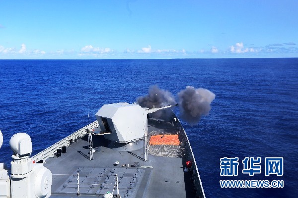 2月19日,在海上現(xiàn)場反擊演練中,長沙艦對(duì)“敵艦”進(jìn)行主炮火力射擊。
