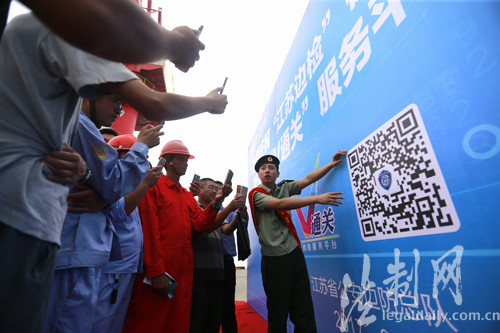 ????8月18日,江蘇邊防總隊鹽城邊防檢查站在大豐港集裝箱碼頭開展了“江蘇邊檢”微信公眾號推廣活動,演示“V通關”服務流程,解答服務對象提問。