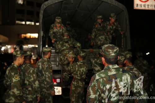珠海公安邊防支隊官兵登車前往受災嚴重區(qū)域搶險救災