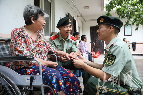 ????8月29日下午,江蘇邊防總隊(duì)連云港邊檢站面臨復(fù)退的戰(zhàn)士最后一次穿著軍裝走進(jìn)駐地敬老院,看望他們“認(rèn)親”的老人,送上他們退伍前的一聲祝福,并將“認(rèn)親”的老人交到留隊(duì)的戰(zhàn)友手中,將這份愛心傳遞下去。據(jù)悉,這個(gè)站“認(rèn)親”的傳統(tǒng)已經(jīng)延續(xù)了27年,每名官兵都有“認(rèn)親”的孤寡老人,他們和老人之間建立了深厚的感情。(錢逸帆 王鈺)