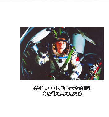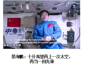 ??? 為了人類的和平與進步,中國人來到了太空。2003年10月15日,我搭乘神舟五號飛船,在太空飛行14圈,歷時21小時23分,完成了中國首次載人航天飛行。雖然是獨自在太空飛行,但一想到億萬祖國人民翹首以待,我覺得不是一個人在飛。于是我拿起太空筆,在工作日志的背面寫上了這樣一句話:“為了人類的和平與進步,中國人來到了太空”,并在艙內(nèi)鏡頭前向祖國人民、世界人民展示?!盀榱巳祟惖暮推脚c進步”,是中國發(fā)展載人航天事業(yè)的初衷,“中國人來到了太空”既描述了一個歷史時刻,也表達了我為祖國航天事業(yè)感到無比自豪的心情。?