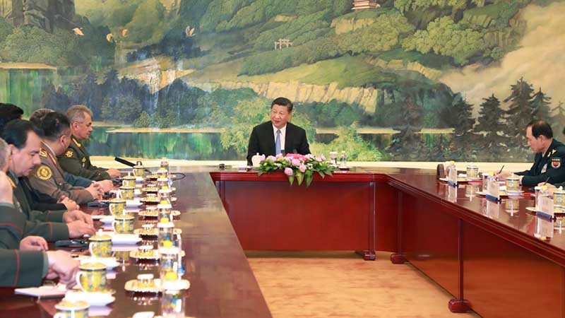 ??? 4月23日,國(guó)家主席習(xí)近平在北京人民大會(huì)堂集體會(huì)見(jiàn)上海合作組織成員國(guó)國(guó)防部長(zhǎng)。 新華社記者李剛 攝