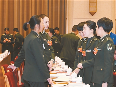 ??? 三月七日上午,出席十三屆全國人大二次會議的解放軍和武警部隊(duì)代表團(tuán)舉行第一次全體會議。會議間隙,女代表們相互討論交流。解放軍報(bào)記者 馮凱旋攝