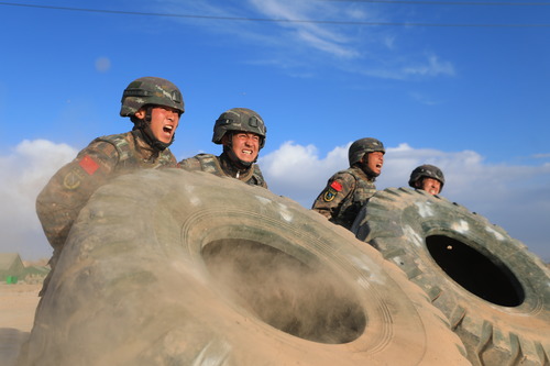 ????武警新疆總隊(duì)某機(jī)動(dòng)支隊(duì)特戰(zhàn)一中隊(duì)組織官兵進(jìn)行翻輪胎體能訓(xùn)練(10月30日攝)。新華社發(fā)(張文 攝)