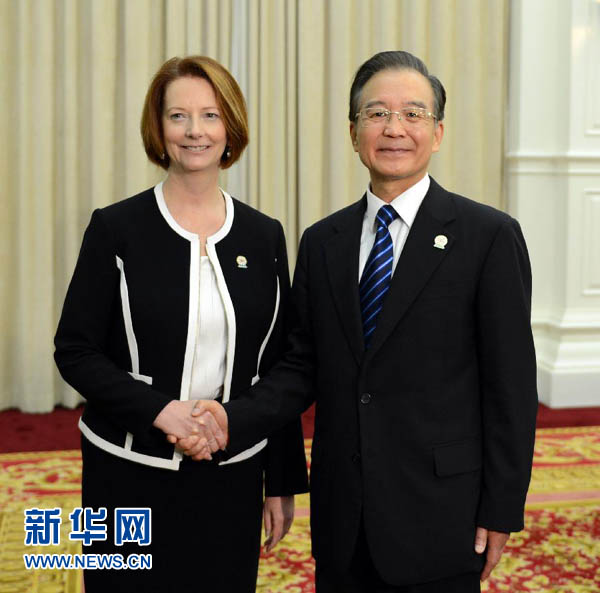 11月20日,國務(wù)院總理溫家寶在金邊會見澳大利亞總理吉拉德。新華社記者張鐸攝