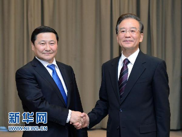 ??? 12月5日,國(guó)務(wù)院總理溫家寶在比什凱克會(huì)見蒙古國(guó)總理阿勒坦呼亞格。 新華社記者謝環(huán)馳攝