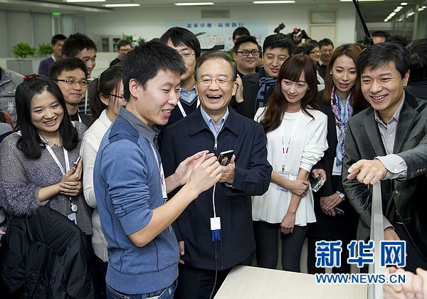 ??? 12月13日,國務(wù)院總理溫家寶到北京中關(guān)村考察并與部分企業(yè)負責人座談。這是溫家寶在百度公司考察時,試用手機語音搜索。 新華社記者黃敬文 攝