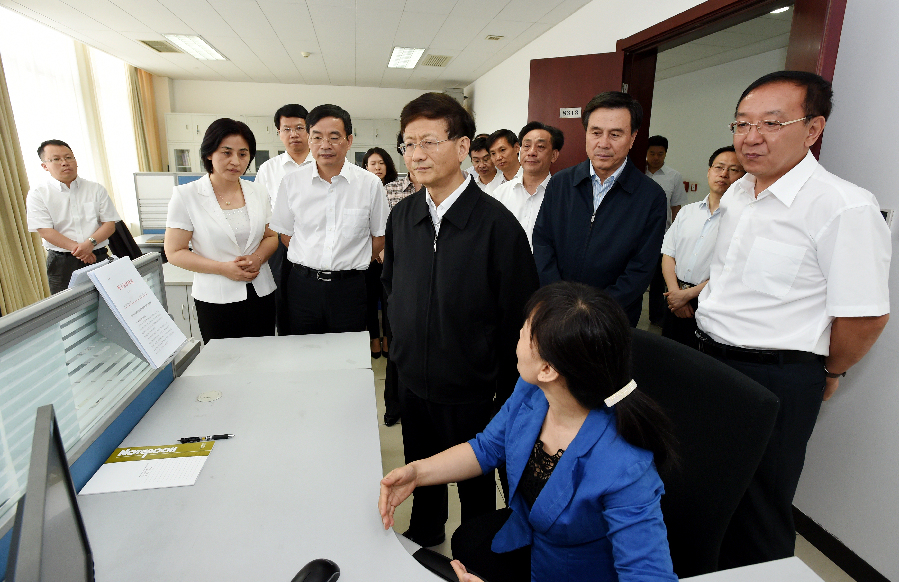 5月27日,中共中央政治局委員、中央政法委書記孟建柱在國家信訪局調研。圖為孟建柱查看國家信訪信息系統(tǒng)運行情況。
