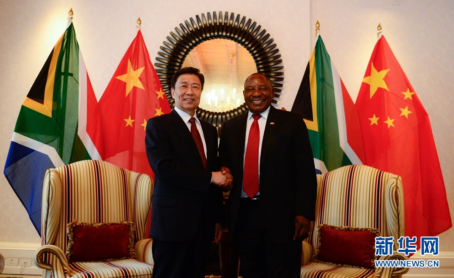 11月22日,在南非開普敦,中國國家副主席李源潮(左)與南非副總統(tǒng)拉馬福薩舉行會談。 新華社記者翟健嵐攝