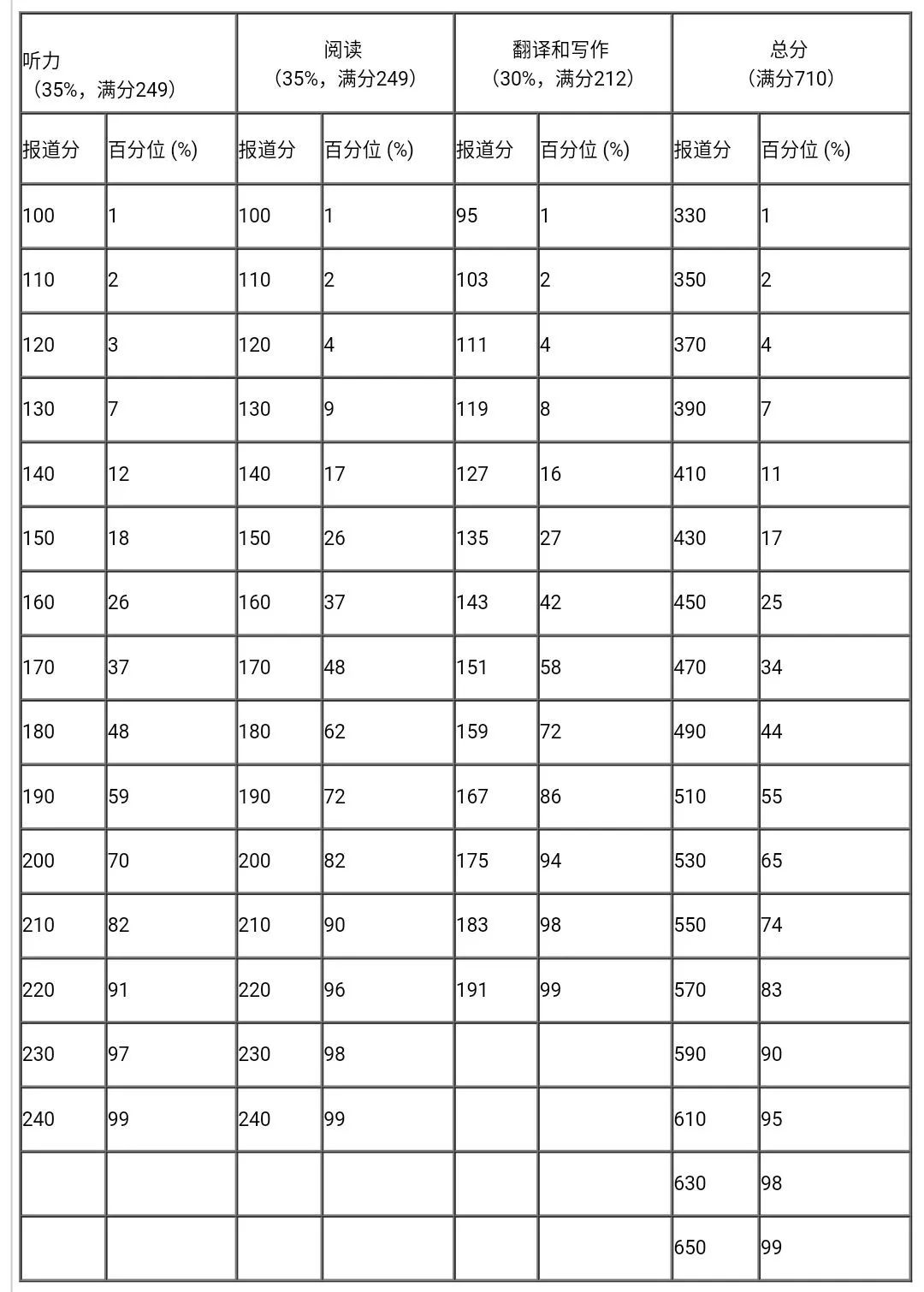 每次考試等值后的卷面分數(shù)都參照常模轉換為報道分。四、六級考試報道總分為710分,計算公式為: