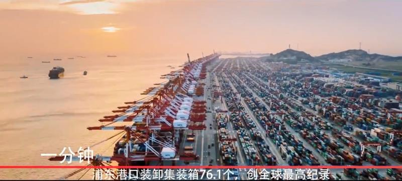 一分鐘,浦東港口裝卸集裝箱76.1個(gè),全年集裝箱年吞吐量近4000萬標(biāo)箱,創(chuàng)全球港口集裝箱運(yùn)輸史最高紀(jì)錄。