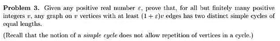 讓中國(guó)隊(duì)全軍覆沒(méi)的第3題,翻譯過(guò)來(lái)的大致意思是:給定任何一個(gè)正實(shí)數(shù)e,證明除了有限個(gè)正整數(shù)以外的所有正整數(shù)v,任何有v個(gè)頂點(diǎn)并且有大于等于 (1+e)v條邊的圖至少包含兩個(gè)不同的等長(zhǎng)簡(jiǎn)單回路。