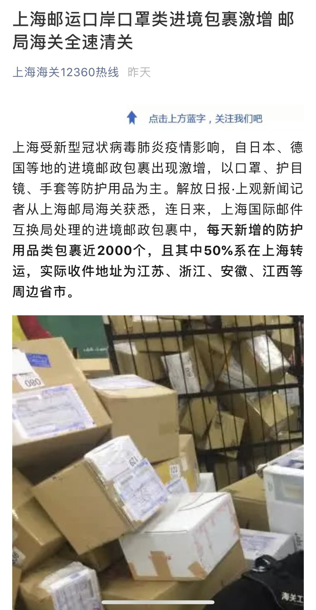 (上海郵運(yùn)口岸口罩類(lèi)進(jìn)境包裹激增 郵局海關(guān)全速清關(guān))