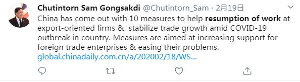 推特用戶Chutintorn Sam Gongsakdi說:在應(yīng)對新冠肺炎疫情期間,中國出臺(tái)了10項(xiàng)措施來幫助出口企業(yè)復(fù)工復(fù)產(chǎn),并推動(dòng)貿(mào)易的穩(wěn)定增長。這些措施旨在加強(qiáng)對外貿(mào)企業(yè)的支持,并解決它們面臨的問題。