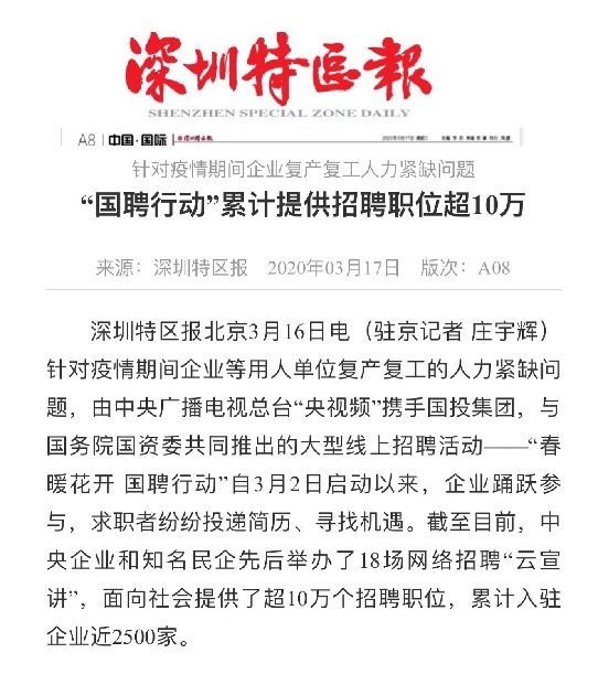 由中央廣播電視總臺“央視頻”攜手國投集團,與國務院國資委共同推出的大型線上招聘活動——“春暖花開 國聘行動”,自3月2日啟動以來,企業(yè)踴躍參與,求職者紛紛投遞簡歷。截至3月14日已面向社會提供了超10萬個招聘職位,累計入駐企業(yè)近2500家,引發(fā)眾多媒體和網(wǎng)站轉(zhuǎn)載報道。