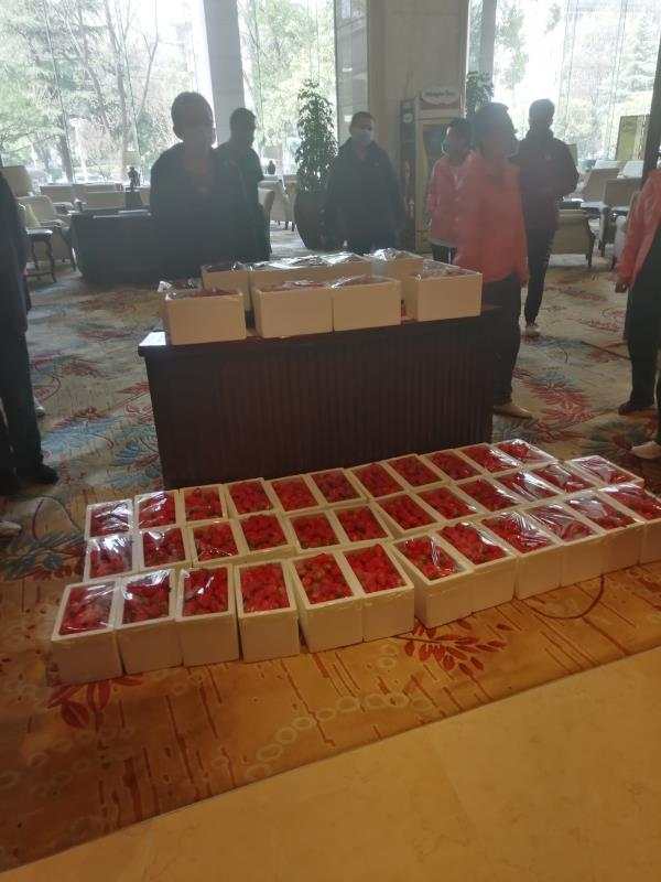 18日,河北省部分援鄂醫(yī)護(hù)人員將返回河北,獲悉這個信息后,在17日上午,武漢市江岸方艙醫(yī)院治愈的患者將百余箱新鮮草莓送到了河北醫(yī)護(hù)人員手里。