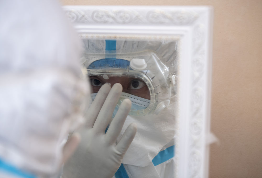 ↑3月13日晚,“擺渡人”小分隊(duì)隊(duì)員楊暉檢查護(hù)目鏡的佩戴情況。隊(duì)員的防護(hù)措施同重癥病房的醫(yī)生一樣,完成所有防護(hù)措施要經(jīng)過12個(gè)步驟。在華中科技大學(xué)同濟(jì)醫(yī)學(xué)院附屬同濟(jì)醫(yī)院光谷院區(qū),有很多生命“擺渡人”。“擺渡人”日夜在醫(yī)院與醫(yī)院之間,留觀點(diǎn)與醫(yī)院之間穿梭不停,轉(zhuǎn)運(yùn)新冠肺炎患者。