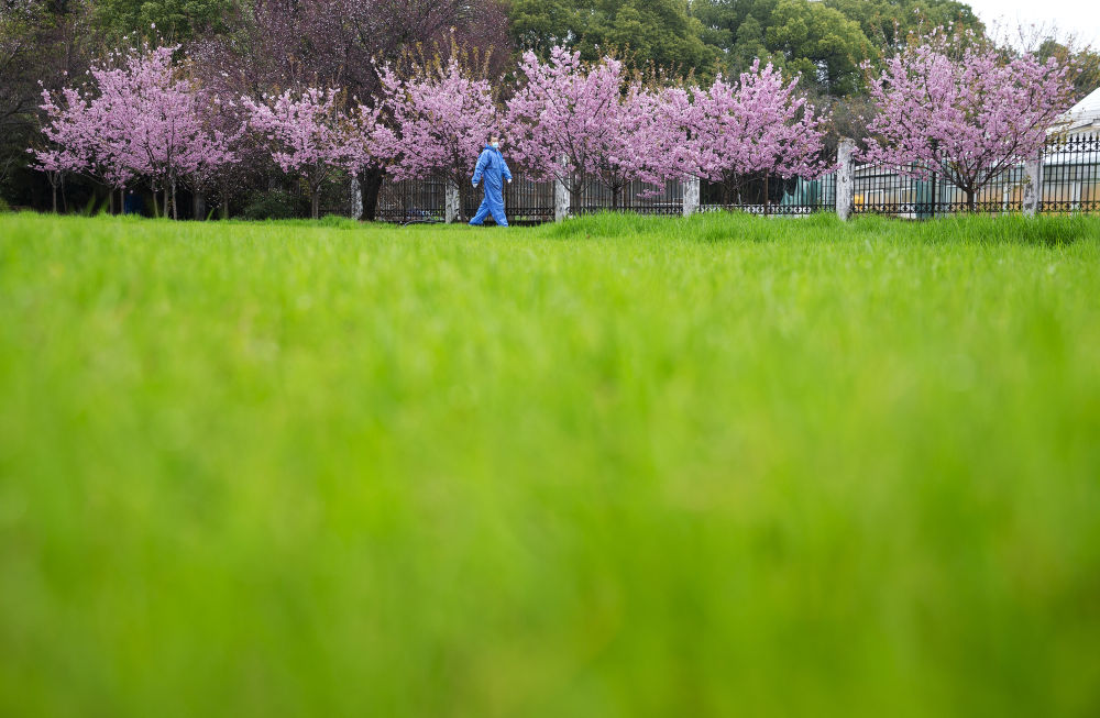 ↑3月3日,一名工作人員從盛開的櫻花樹下走過。由于學(xué)校進(jìn)行封閉管理,我在這幾顆櫻花樹旁等了一個(gè)多小時(shí),只遇到了兩個(gè)人。