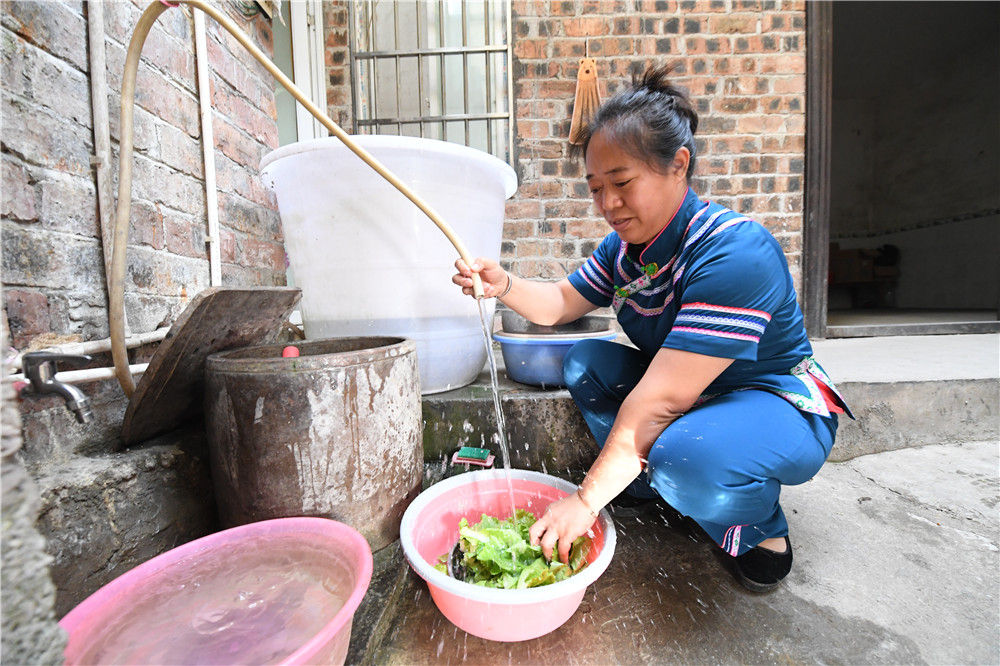 在廣西環(huán)江毛南族自治縣下南鄉(xiāng)下南社區(qū)松朗屯,覃鳳增在用自來水洗菜(5月22日攝)。新華社記者 陸波岸 攝