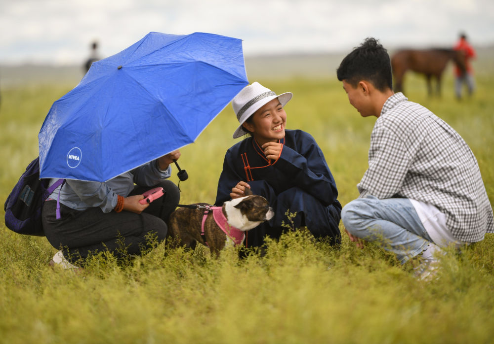 8月3日,錫林花(中)在草地上與小伙伴包音圖(右)聊天。