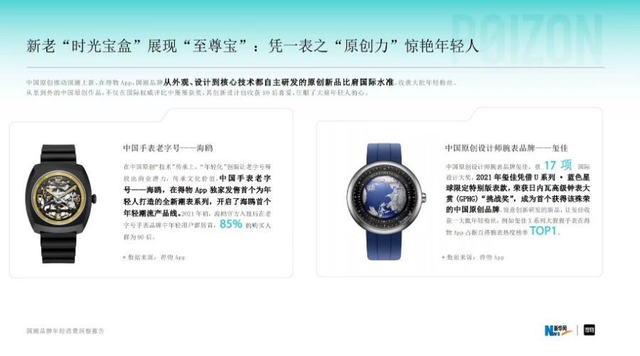 新国潮品牌通过钻研年轻人的生活需求细节,推动多样的创意新品研发与灵活供给。无论是被年轻人当潮流配饰的“耳机”,还是仅凭一款单品跃居行业黑马的“剃须刀”;70%女生买的“篮球捧花”,还是75%男生买的“水晶鞋”;把平平无奇的“磁铁”设计成13万小情侣秀恩爱的“手链”,还是上架即必买的“颈椎按摩器”……《报告》通过一系列品牌案例,展示了国潮品牌被年轻人生活细节点亮灵感后的上新“群像”。更有一些从外观、设计到核心技术都自主研发的“中国原创”品牌,在问鼎国际权威大奖同时,在得物App频登新品热榜,收获大批年轻粉丝。