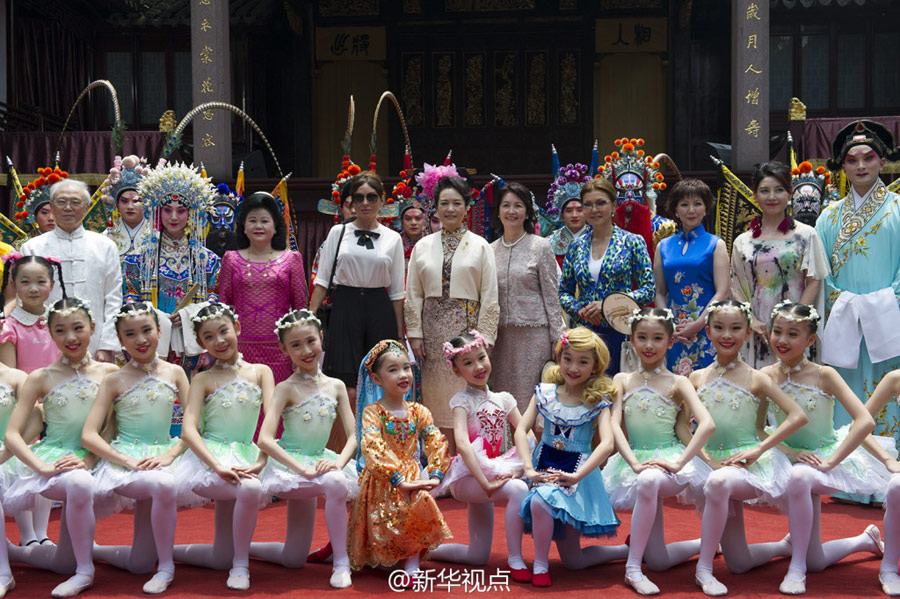 ????彭麗媛和貴賓們到上海豫園,參觀金山農(nóng)民畫、面塑、顧繡、木版水印、扎染等展示,欣賞少兒歌舞《茉莉花》、昆曲《牡丹亭》選段、滬劇與二胡《燕燕做媒》、太極·古琴《高山流水》、京劇選段《梨花頌》等演出。