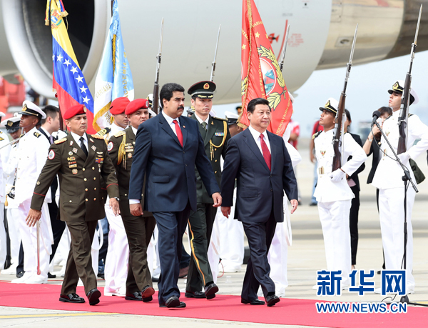 ????馬杜羅在機(jī)場為習(xí)近平舉行隆重歡迎儀式。兩國元首登上檢閱臺。軍樂團(tuán)奏委中兩國國歌,升中國國旗。習(xí)近平在馬杜羅陪同下檢閱儀仗隊(duì)。