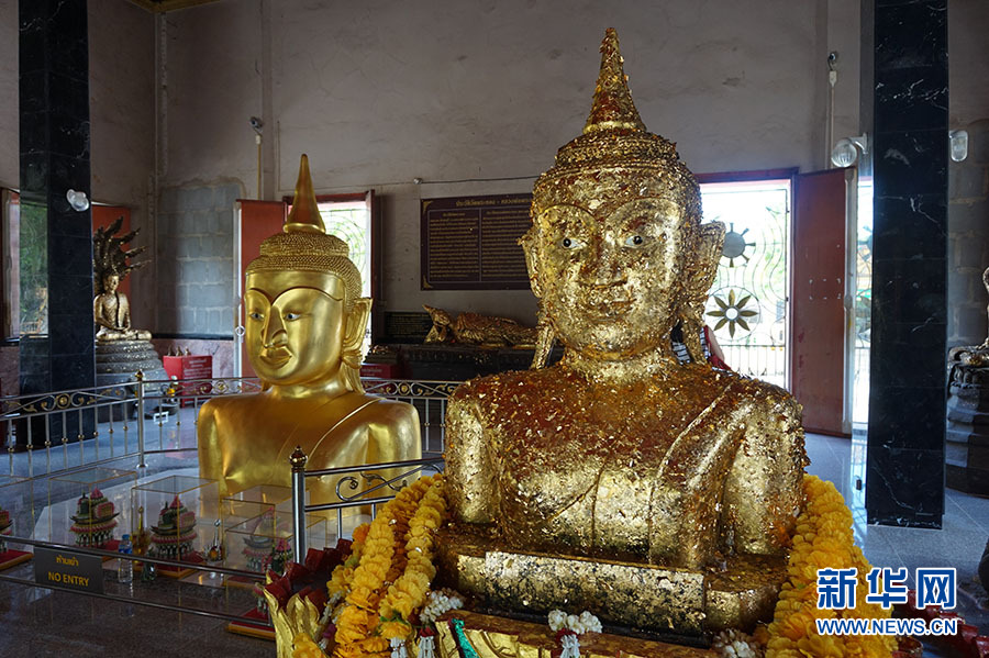 金佛寺內(nèi)供奉的半身金佛(左)及被貼滿金箔的金佛模型(右) ?新華網(wǎng)記者 楊云燕 攝