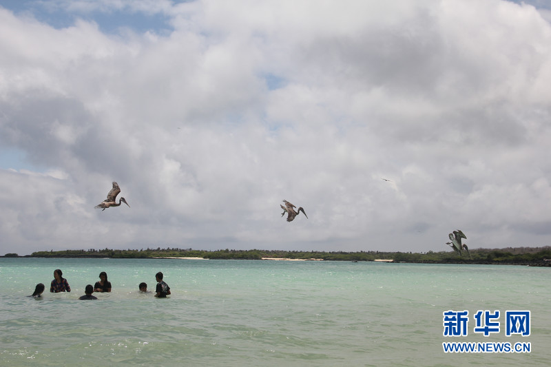 加拉帕戈斯群島中部的圣克魯斯(Santa Cruz)島上,數(shù)只鵜鶘在捕食,人們在水中嬉戲,相處和諧。