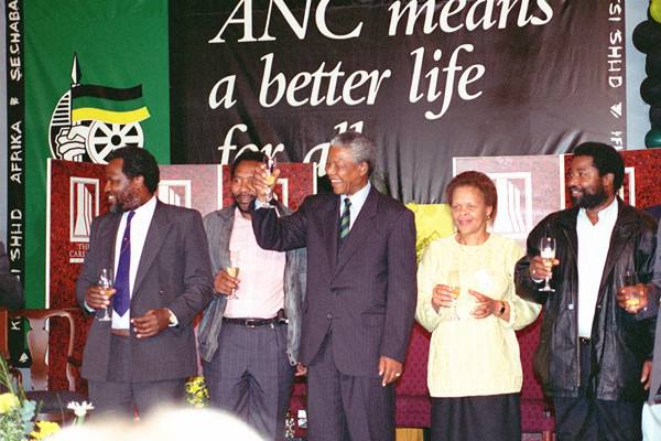 1994年5月2日,曼德拉和他的戰(zhàn)友們在約翰內(nèi)斯堡的卡爾頓飯店大廳慶祝當(dāng)選總統(tǒng)。(新華社發(fā))