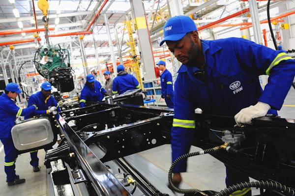 2014年7月10日,中國(guó)第一汽車集團(tuán)在南非東開普省曼德拉灣市舉行南非庫(kù)哈工廠落成及首輛機(jī)車下線儀式。圖為工人在中國(guó)一汽南非工廠生產(chǎn)線上工作。 (新華社記者張川石攝)