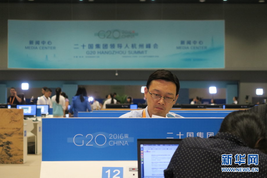 二十國集團領導人第十一次峰會9月4日至5日在浙江杭州舉行。峰會新聞中心一派繁忙景象,境內(nèi)外各路媒體記者使出“洪荒之力”,實時報道峰會動態(tài)。新華網(wǎng)記者 陳競超 攝