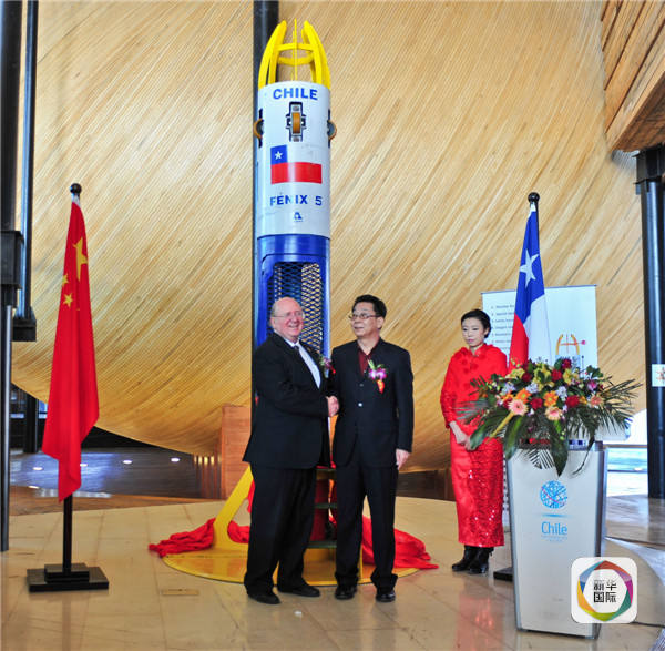 2014年1月10日,時任智利駐華大使路易斯·施密特(左一)與天津凱威投資集團(tuán)有限公司董事長吳玉凱出席“鳳凰5號”揭幕儀式。(新華社記者翟健嵐攝)