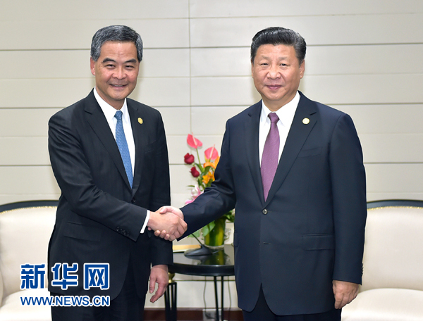 11月20日,國家主席習(xí)近平在秘魯首都利馬會見前來出席亞太經(jīng)合組織第二十四次領(lǐng)導(dǎo)人非正式會議的香港特別行政區(qū)行政長官梁振英。新華社記者 李濤 攝