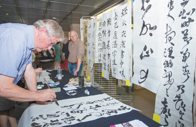 日內(nèi)瓦大學孔子學院舉辦的中國書法展示活動上,一位當?shù)貪h語愛好者展示書法技藝。