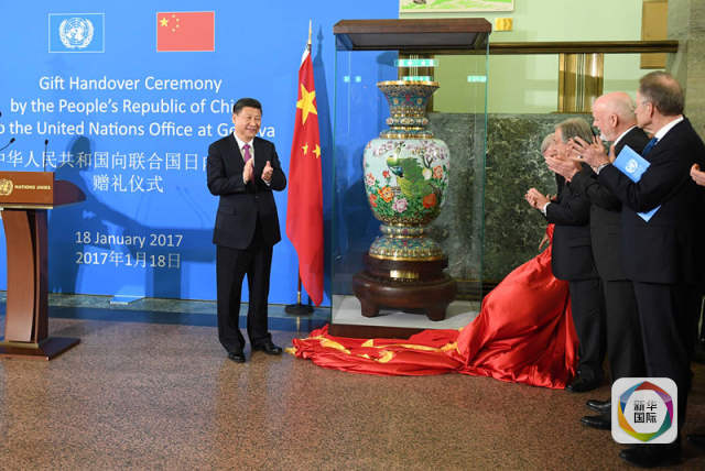 1月18日,國家主席習近平在瑞士日內(nèi)瓦萬國宮出席“共商共筑人類命運共同體”高級別會議,并發(fā)表題為《共同構(gòu)建人類命運共同體》的主旨演講。這是會議結(jié)束后,習近平出席中國向聯(lián)合國日內(nèi)瓦總部贈禮儀式。(新華社記者張鐸攝)