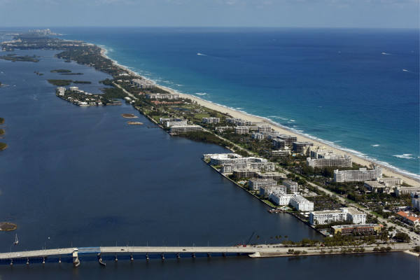 這是2017年3月20日航拍的美國佛羅里達(dá)州棕櫚灘的海岸線,海湖莊園就在這個(gè)狹長的小島上。(新華社記者殷博古攝)