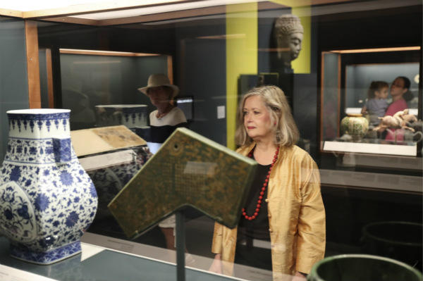 勞里·巴恩斯正在展館內(nèi)觀看中國文物。(新華社記者王迎攝)
