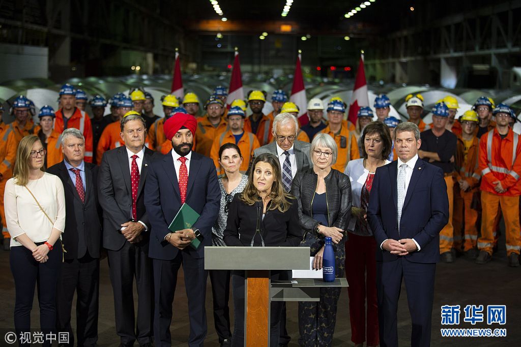 當(dāng)?shù)貢r間2018年6月29日,加拿大漢密爾頓,加拿大外交部長弗里蘭、經(jīng)濟發(fā)展部長貝恩斯和勞工部長哈伊杜造訪斯特爾科鋼鐵公司,并共同宣布從7月1日起,加拿大將對約126億美元從美國進口的商品加征關(guān)稅,以報復(fù)特朗普政府對加拿大鋼鋁產(chǎn)品加征關(guān)稅。他們還表示,加拿大政府將向本國鋼鋁產(chǎn)業(yè)和制造業(yè)提供約15億美元財政援助。(圖片來源:視覺中國)