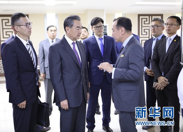 8月25日,在蒙古國首都烏蘭巴托,中國國務(wù)委員兼外交部長王毅(前中)在蒙古國外長朝格特巴特爾(前右)的陪同下專程來到烏蘭巴托成吉思汗國際機(jī)場考察“一帶一路”快速通道并現(xiàn)場了解情況。 新華社記者阿斯鋼攝